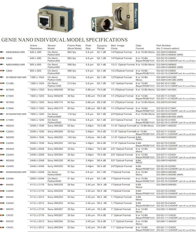 Teledyne DALSA公司推出的Genie Nano系列面阵相机是极具性价比的GigE Vision接口CMOS面阵相机,基于多款业界领先的CMOS传感器 (如Sony Pregius系列和On-Semi Python系列),并加入了专有的相机技术,能够突破千兆网的传输速度限制,采用极为坚固的外壳,能适应更宽的工作温度范围,同时集多种功能于一身。 Genie Nano相机结合了标准千兆网技术 (符合GigE Vision 1.2协议),采用Teledyne DALSA的Trigger-to-Image-Reliability框架来进行可靠的采集和传输图像到主机中。Genie Nano系列相机提供多种型号可选,涵盖多种图像分辨率、传感器、性能,以及黑白、黑白NIR和彩色版本。